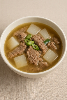 소고기뭇국의 깊고도 맑은 맛을 내기 위해서는 재료의 손질부터 세심함이 필요하다. 먼저 국거리용 소고기를 선택할 때에는 핏물이 너무 많거나 지방이 과도한 부위보다는 기름기와 살코기가 적절히 섞인 양지머리나 사태 같은 부위를 선택하는 것이 좋다. 이런 부위는 푹 끓였을 때 육수에 풍부한 감칠맛을 더해주는 동시에 지나치게 기름지지 않아 맑고 개운한 국물 맛을 완성할 수 있다. 소고기를 찬물에 30분 정도 담가 핏물을 뺀 후 키친타월로 물기를 닦고 먹기 좋게 썬다. 무는 껍질을 벗긴 뒤 도톰하게 나박 썰기 또는 반달 썰기로 준비하는데 너무 얇으면 끓는 과정에서 쉽게 부서져 무의 시원한 맛이 국물에 온전히 스며들지 않게 된다. 양파나 파, 마늘 등 부재료도 국물의 풍미를 좌우하는 핵심 요소다. 양파는 단맛을, 파는 향을, 마늘은 깊이를 더해주므로 각 재료는 생략 없이 넣는 것이 좋다. 특히 다진 마늘보다는 통마늘을 반으로 잘라 넣는 것이 국물의 흐름을 망치지 않으면서 은은한 맛을 남긴다. 고기를 먼저 참기름에 볶아주는 단계도 중요한데 이 과정에서 고소한 향이 올라오면서 소고기의 잡내가 제거되고 나중에 무와 함께 끓였을 때 진한 국물이 완성된다. 너무 강한 불에서 볶으면 고기가 겉돌 수 있으므로 중불에서 천천히 볶아야 하며 이후 무를 넣고 함께 볶아 들기름 또는 참기름을 추가로 두르면 더욱 풍부한 고소함을 만들 수 있다. 물은 끓는 물을 붓는 것이 좋으며 찬물을 사용할 경우 육수의 맑은 맛이 떨어질 수 있으니 주의가 필요하다. 물을 붓고 난 뒤에는 떠오르는 거품을 걷어내고 약불에서 충분히 끓이면서 무가 투명해지고 부드러워질 때까지 기다리는 것이 핵심이다. 무가 너무 익기 전까지는 간을 하지 않는 것이 좋으며, 어느 정도 익은 뒤 국간장과 소금으로 간을 맞추는 것이 훨씬 깔끔한 맛을 낼 수 있는 비결이다. 특히 국간장은 감칠맛을 살리고 국물 색이 탁해지지 않게 도와주며, 완성 단계에서 후춧가루나 대파를 넣으면 마무리 향이 살아난다. 이처럼 재료 하나하나의 손질과 순서를 지키는 태도는 결과적으로 한 그릇의 국물에서 섬세한 조화를 완성시켜 준다.